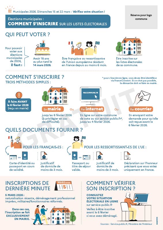 Élections municipales 15 et 22 mars 2026 : des infographies neutres, prêtes à être imprimées ou diffusées en ligne, pour expliquer le scrutin à vos habitants.